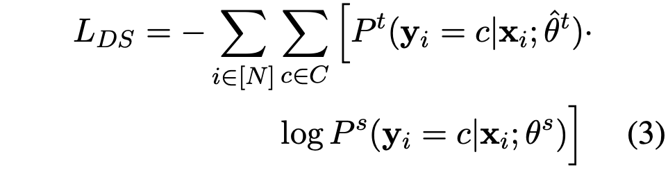 Teacher와 student를 비교할 때도 cross-entropy loss를 사용하는데, 아래와 같습니다.