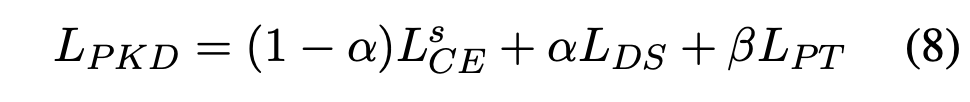 최종적으로는 3개의 loss L^s_CE, L_DS, L_PT의 linear combination인 L_PKD