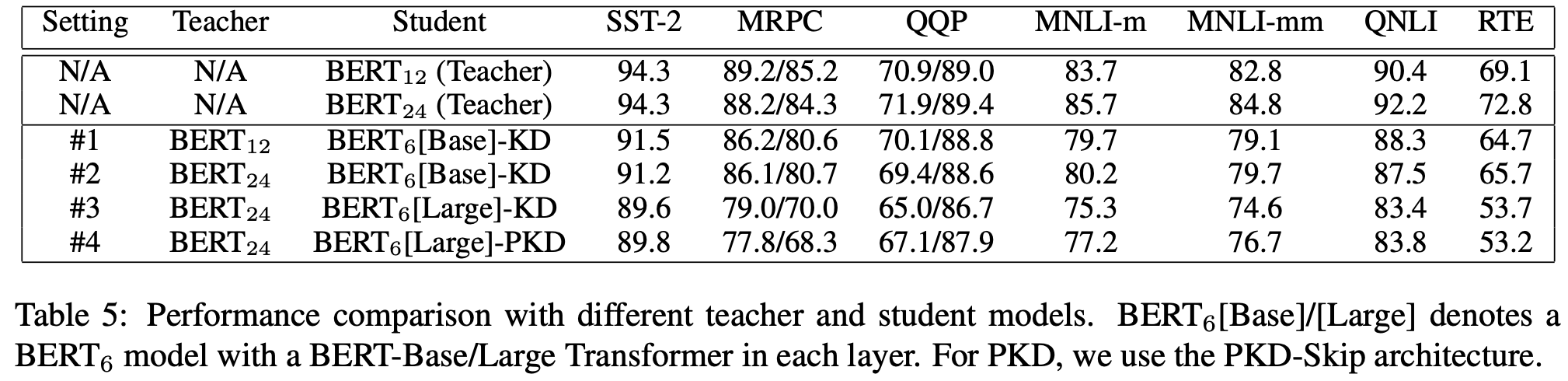 Teacher model의 크기에 따른 실험도 했는데, 아래 표를 보면 꼭 teacher model이 크다고 좋은건 아닌 것을 알 수 있습니다. (#1 and #2) 또한, #1과 #3을 비교했을 때는 BERT-Large로부터 distillation을 했을 때 BERT-Base로부터 distillation을 한 것 보다 더 성능이 안나오는 것을 볼 수 있는데, 저자들은 너무 많이 compress하게 되면 knowledge distillation이 어려워지기 때문이라고 설명합니다. 마지막으로, PKD와 KD를 비교하면 (#3 and #4) PKD의 경우 consistent한 성능의 향상이 있음을 알 수 있습니다.