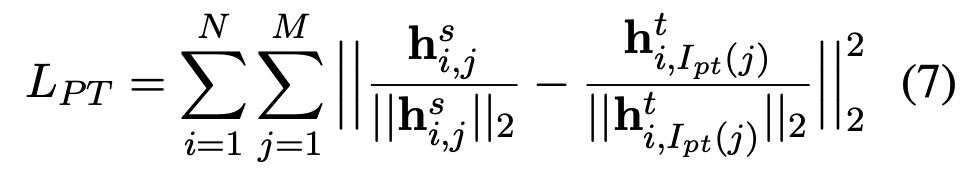 PKD의 핵심은 여기에 추가적으로 "patient"한 knowledge distillation을 위한 loss를 하나 더 추가하는 것 입니다. 바로 student model과 teacher model의 hidden state vector들 역시 가까워지도록 하는 것인데, 다음과 같은 loss를 이용합니다.
