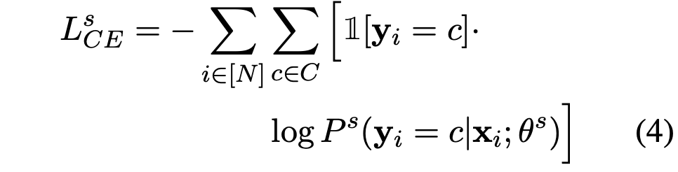 앞에서 언급했듯이, KD에서는 기존에 사용하는 loss와 더불어 student model의 prediction을 teacher model과 가까워지도록 하는 loss를 동시에 minimize하게 됩니다. PKD에서는 전자의 경우 pre-training을 추가적으로 하지 않고 target task에 바로 훈련을 시키며, classification의 경우 아래와 같은 cross-entropy loss를 사용합니다.