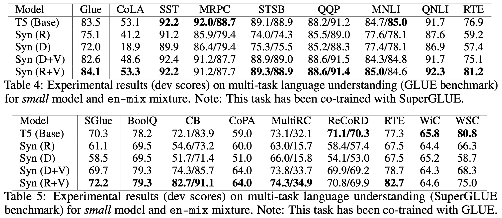 마지막으로, T5(Text-to-Text Transformer)를 baseline으로 삼아서 GLUE/SuperGLUE benchmark에 실험을 한 결과도 나와있습니다. 표에서 볼 수 있듯이, Random 혹은 Dense Sythesizer만 사용한 모델은 성능이 좋지 않지만, Random과 Vanilla를 같이 사용한 모델은 기존 baseline에 비해서 성능이 크게 향상되는 것을 볼 수 있습니다.