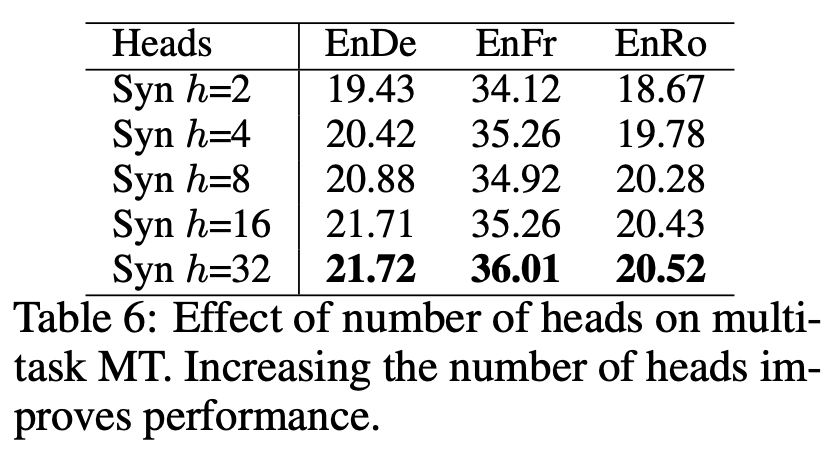 이 외에도, 각 Synthesizer로 train된 attention weight(softmax를 취한 결과값)의 분포와 head 갯수 별 성능에 대해서 실험한 결과도 나타나 있습니다. 아래의 그래프를 보면 각 layer에 대해서는 비슷한 분포를 보이고, layer 내에서는 Vanilla Synthesizer에 비해서 Random이나 Dense가 더 variation이 높게 나타나고, Dense Synthesizer의 weight은 0 근처에 몰려있는 반면, Random Synthesizer는 좀 더 0에서 멀리 퍼져있습니다. head 갯수에 따른 성능은 pre-training을 하지 않은 T5를 Machine Translation에 적용했을 때, head 수가 증가할 수록 성능 역시 올라가는 것을 확인했습니다.