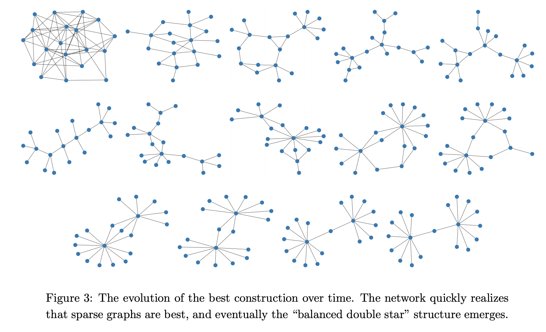 아래의 그림은 iteration이 지날수록 변화하는 그래프의 모습을 나타낸 것인데, 처음에는 매우 random한 형태의 그래프로 시작했다가 점점 특정한 구조를 가지게 되면서 결국 마지막에는 "balanced double star"라고 부를 수 있는, 두개의 star graph가 연결된 형태로 수렴하는것을 알 수 있습니다. 사실, 위의 conjecture 2.1은 이미 이 논문에서 반례가 제시되었는데, 논문의 반례는 vertex가 600개인 그래프라는 점에서 neural network가 훨씬 더 작은 반례를 찾아낼 수 있었다는것에 의의가 있습니다.