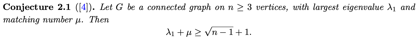 첫번째 conjecture는 그래프의 spectrum과 matching number, 그리고 vertex의 갯수에 대한 부등식으로, 다음과 같습니다.