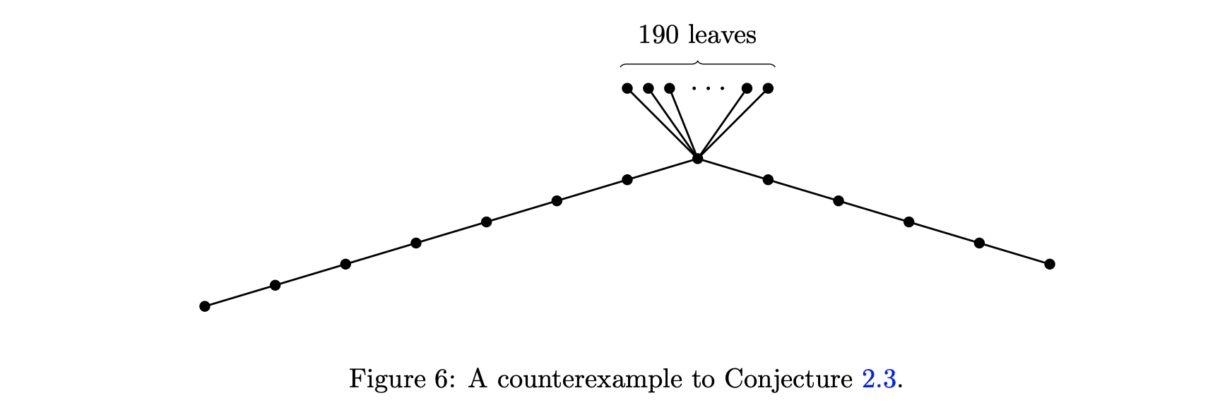 용어들에 대해서 설명하자면, 그래프의 eigenvalue란 그래프의 Laplacian matrix의 eigenvalue를 말하는데, 여기서 laplacian matrix는 그래프의 인접행렬(adjacency matrix) A와 차수행렬(degree matrix, 대각성분이 각 vertex의 degree인 행렬) D의 차이인 L = D - A로 정의되고, 이 행렬은(특히 eigenvalue는) 그래프의 엄청나게 많은 성질들을 담고 있음이 알려져있고, 이를 연구하는 분야가 바로 spectral graph theory입니다(예를 들어, largest eigenvalue의 값이 2인것과 그래프의 각 connected component가 nontrivial bipartite graph라는것이 동치임이 알려져 있습니다). Matching number는 주어진 graph의 subgraph중에서 각 vertex의 degree가 1 이하인, 즉 모든 edge가 서로 인접하지 않는 subgraph(matching이라고 부릅니다)의 edge 갯수 중 최댓값을 의미합니다. 이름 그대로 맺을 수 있는 짝의 최댓값 정도로 생각하면 될 것 같습니다. 위의 부등식은 임의의 연결그래프의 가장 큰 eigenvalue와 matching number의 합이 항상 sqrt(n-1) + 1 이상이라는 것인데, 이 논문의 저자는 이에 대한 반례를 바로 위에서 언급한 cross-entropy method를 이용해서 찾아냅니다. 자세한 과정은 다음과 같습니다.