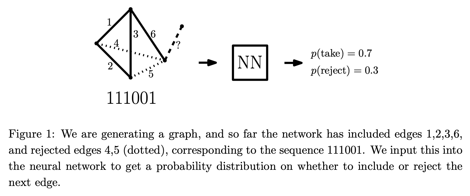먼저, 그래프 자체를 모델의 input으로 넣어줘야 하는데, 총 가능한 nC2 = n(n-1)/2개의 edge중 어떤게 연결되어있고 어떤게 연결되어 있지 않은지를 길이 nC2의 binary sequence로 표현해서 그래프를 나타냅니다. 그 다음, 아직 미완성인 그래프를 state로 생각하고 이를 policy network에 넣어주게 되면 network의 output은 그 다음 index에 해당하는 edge를 추가할 확률을 return합니다. 그러면 이 확률값을 바탕으로 sampling을 해서 그 다음 edge를 추가할지 안할지를 결정하고, 이를 모든 nC2개의 edge에 대해서 차례대로 수행합니다. (마치 GPT와 같은 causal language modeling과 비슷하다고 할 수 있습니다.) 이렇게 모든 edge에 대해서 생성을 완료하면 vertex n개짜리 그래프가 나오고 이 그래프(=episode)에 대해서 reward(여기서는 return과 같습니다)를 다음과 같이 계산합니다.