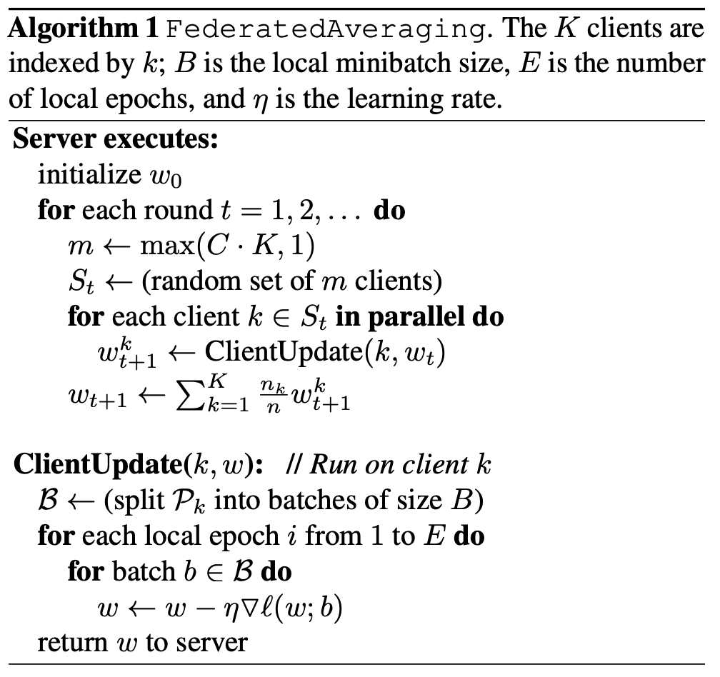 Federated Learning이란, 구글에서 발표한 이 논문에서 처음 제시한 개념으로, 연합 학습이라는 이름처럼 모델을 서로 다른 장치(클라이언트에 해당)에서 학습을 시킨 뒤, 그 결과를 서버로 한데 모아서 원래의 모델을 업데이트 하는 것을 말합니다. 좀 더 정확히 말하자면, 먼저 클라이언트들 중에서 일부를 임의로 고른 뒤, 해당 클라이언트들에게 서버에 있는 메인 모델을 보냅니다. 그 후, 보내진 메인 모델을 각 클라이언트가 가지고 있는 로컬 데이터를 이용해서 학습을 시킨 뒤, 학습된 weight들을 다시 서버로 보내서 이들의 가중평균을 취해 모델을 새로 업데이트 합니다. 이는 각 클라이언트에서 계산한 gradient의 가중평균으로 메인 모델을 학습시킨다고도 볼 수 있습니다. 여기서 단순한 평균이 아닌 가중 평균을 취할 때는 각 가중치가 클라이언트 별 데이터의 숫자에 비례하도록 설정하고, 그 이유는 클라이언트별로 가지고 있는 데이터의 수가 다를 수 있기 때문입니다. 심지어는, 기존의 머신러닝 모델을 훈련할 때와는 다르게 각 클라이언트의 데이터의 분포는 차이가 많이 나는 편입니다. (셀카는 사람에 따라 당연히 달라지죠?) 그렇기 때문에 단순한 평균보다는 가중평균을 취하는 것이 좀 더 좋은 성능을 보일것이라고 생각할 수 있습니다. 또한, 전체 클라이언트가 아닌 일부에 대해서만 하는 이유는 효율성 때문인데, 당연한 사실이지만 클라이언트가 매우 많은 경우에는 모든 클라이언트에 모델을 보내고 학습시킨 뒤 학습된 weight을 다시 서버로 받아오는것은 통신에 대한 비용이 너무 오래 걸릴 수 있습니다. 알고리즘으로 나타내면 아래와 같습니다.