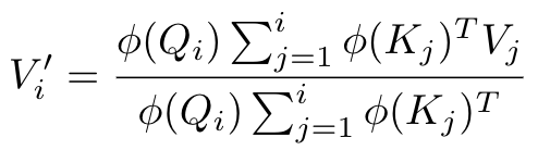 이전 sequence를 input으로 넣어서 다음 token을 뽑아내고, 이를 다시 input으로 넣어서 다음 token을 뽑아내는 과정을 반복하는 autoregressive한 모델을 transformer로 훈련시키기 위해서 vanilla transformer에서는 causal masking이 중요하게 사용됩니다. Linear transformer의 경우에는 따로 그런 triangular matrix 모양의 masking을 만들어 줄 필요가 없고, 위의 attention을 계산하는 식에서 합의 범위를 다음과 같이 바꿔주기만 하면 됩니다.