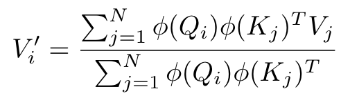이렇게 쓰면 뭐가 달라질까요? 달라집니다! 위의 식에서 합에 들어있는 부분은 query와 상관없는 값이기 때문에 미리 O(N)만에 계산해 놓고 각 query마다 미리 계산된 값을 이용해서 attention layer의 output을 계산하면 되기 때문에 총 시간복잡도가 O(N)으로 줄어들게 됩니다. 공간복잡도 (memory complexity) 역시 분모, 분자의 sum에 해당되는 값을 미리 저장해놓기만 하면 (각각 D by D 혹은 D by N 행렬이기 때문에 N이 D에 비해서 매우 큰 경우 O(1) 혹은 O(N)으로 볼 수 있습니다.) 이 역시 O(N)으로 줄어들게 됩니다.
