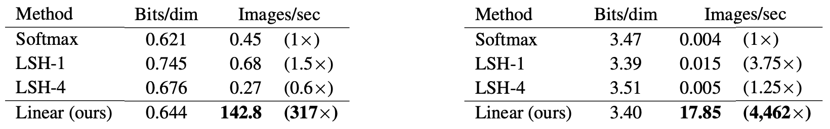 또한, synthetic하게 긴 sequence들을 만들어서 training/inference time과 memory를 비교하였는데, vanilla attention은 sequence의 길이에 대해서 quadratic하게 증가하는 데에 비해서 reformer와 linearized attention은 linear하게 증가하는 것을 볼 수 있고, linearized attention이 reformer에 비해서 memory cost가 더 작은 것을 볼 수 있습니다.