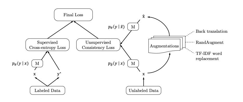 이렇게 모델을 훈련시키게 되면 모델이 좀 더 robust해진다는 장점도 있지만, 또 한가지는 consistency regularization은 label이 없는 이미지를 활용할 수도 있게 해 줍니다. 다시 말해서, semi-supervised learning을 가능하게 해 주는 한가지 접근이라고 할 수 있습니다. 알다시피, label을 다는 것은 사람의 힘이 필요한 굉장이 cost가 많이 들어가는 작업이며, label자체가 없는 이미지들을 활용할 수 있다면 모델을 훈련시킬 때 사용할 수 있는 데이터의 숫자가 훨씬 증가하기 마련이며 모델의 generalizability도 더욱 좋아지게 됩니다.