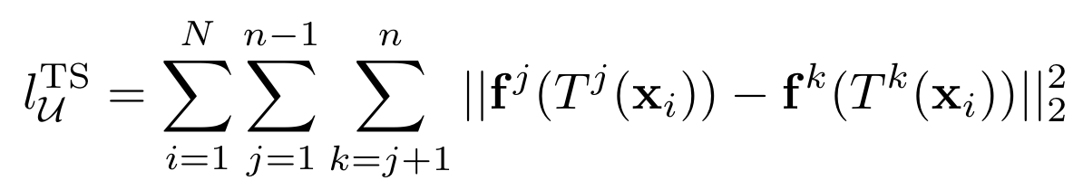 를 바탕으로 모델을 훈련시키면 됩니다. (TS는 Transformation Stability의 약자입니다.) 위의 식에서 f^j는 j번째 pass에 대응되는 모델인데, 같은 모델 & 같은 입력이라고 하더라도 dropout / random pooling 등을 적용하게 되면 그 때 마다 output이 달라질 수 있기 때문에 f^j들은 실제로 모두 다른 모델이 됩니다. 이 loss는 서로 다른방식으로 augment된 두 input에 대한 output을 비교하기 때문에, input의 label 유무는 중요하지 않고 따라서 label이 없는 이미지들을 활용할 수 있게 됩니다.