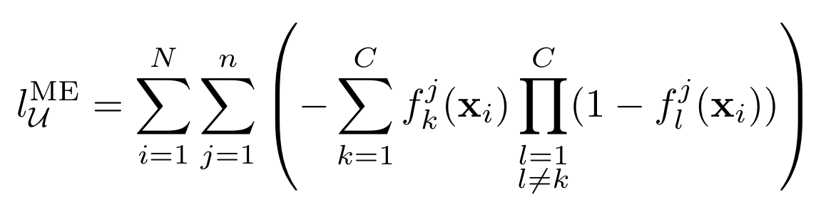 f_k^j(x_i)는 x_i가 k번째 class에 속할 확률의 모델의 예측값이며, 큰 괄호 안에 있는 값은 하나의 값이 1이고 나머지가 0일 때 -1로 최솟값을 갖는 것을 확인할 수 있습니다. 이는 이 논문에 소개된 Entropy Minimization과 비슷한 효과를 주는 loss로 볼 수 있습니다. 이 역시 label이 존재하지 않는 샘플들에 대해서 계산할 수 있습니다. 최종적으로는 기존 supervised learning에서의 Cross-Entorpy loss에 위의 consistency & mutual-exclusivity loss를 모두 더해서 한번에 모델을 훈련시킵니다.